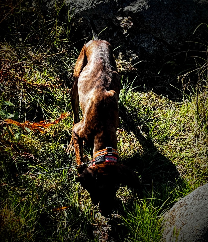 Sitting on cool granite Sun streaming warmth upon me Capturing an image of a stalwart baby pine Relishing the peace The beauty The generous gifts of nature I drink deeply of healing mountain air Startled then Panting Rapid panting A warm body pressed against my back Wetness now on the back of my arm Twisting my neck Only to see a snout, Brindle coat wrapped tightly Encasing protruding ribs She was not seeking attention in the way of other dogs But neither was she acting aggressively She just kept returning Seemingly wanting proximity Remaining nearby A black lab joined her Antennae attached to a collar Hip bones visible through midnight coat Panting Asking for what? Petting seems foreign to them both Neither good nor bad Not insisting upon nor rejecting They remain nearby The lab choosing to squeeze between my friend’s chair and mine Again, and again. Choosing confined space Over the open acres surrounding us on this mountain Eventually she responds to touch Leaning in, asking for more Shyly though Garmin collars banded around their necks Working dogs Digging into wet soil Seeking refreshment A truck barrels up the mountain road Our companions respond to a whistle Back to work Be safe my new friends Be safe Shattered Silence Saddened Soul Did they feel love? If only for a moment Did they know love?