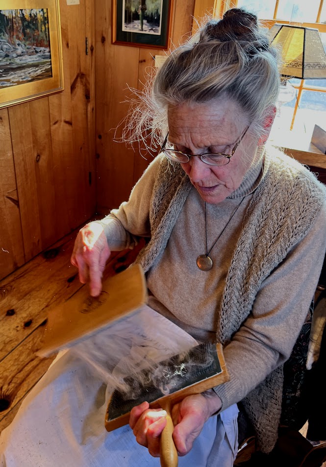 She pulls off a piece So light, airy, and soft She cards it Almost a caress with two brushes Working the individual fine strands Until they lie parallel to each other She pulls off some for me to touch I cannot help but stroke fibers There is no itch No irritation It looks like a cirrus cloud Delicate and wispy.