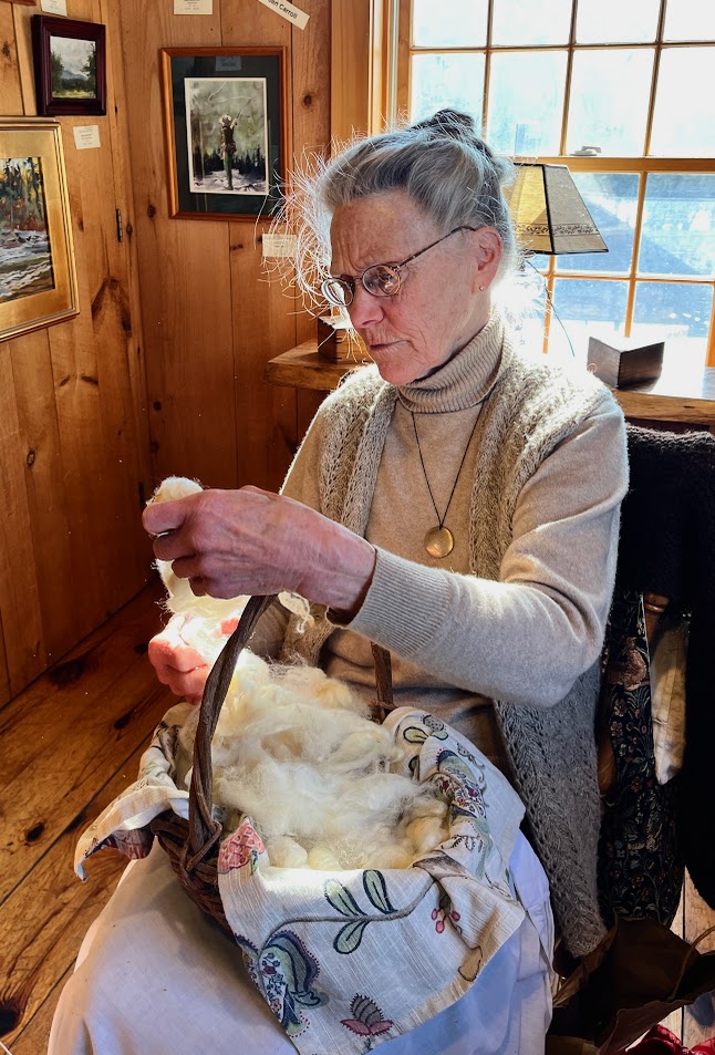 Raw, washed wool Fills her basket now Lying in bunches It looks like matted clumps of cotton Greyish white With flecks of black From the hay in the meadow The dirt of the soil
